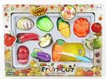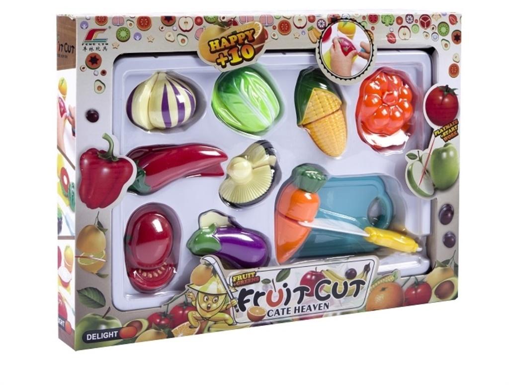 Warzywa i owoce wraz z tacką i plastikowym nożykiem dzięki któremu możemy przekrajać owoce bądź w warzywa w miejscu ich łączenia na rzepach.