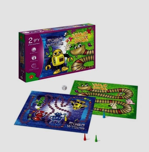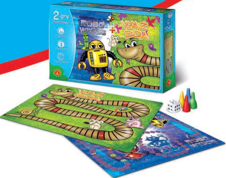 "Wąż Boa" to gra, która opowiada o zorganizowanych w lesie zawodach sportowych. Wszystkie zwierzątka chcą w nich uczestniczyć, a liczy się szybkość z jaka pokonują tor przeszkód. Każdy z zawodników musi przejść jak najszybciej po Wężu Boa by dotrzeć do mety. "Robo wyścig" to gra, której wehikuł przeniósł Cię do odległej przyszłości. Musisz jak najszybciej dostać się na sąsiednią planetę, z której odlatuje kosmiczny statek na Planetę Ziemię. Jeśli nie zdążysz, na zawsze pozostaniesz w kosmosie. Zawartość pudełka: dwustronna plansza, 4 pionki, kostka do gry, instrukcja. 5+ 1-4 graczy 25-60 minut