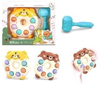 W zestawie: podstawka w kształcie donuta, młotek, Funkcje: gra polega na uderzaniu w kolejno wyskakujące robaczki, Pozostałe informacje: śr. zabawki 16 cm, wym. opak. 25 x 20 x 6,5 cm, 3+