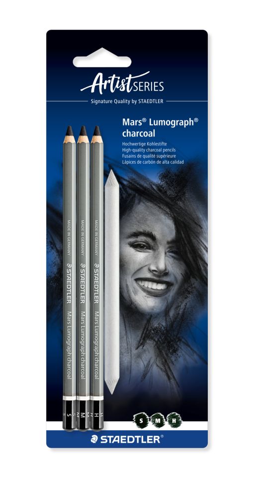 Wysokiej jakości węgiel w ołówku. Specjalna formuła łączy odpowiednio węgiel drzewny i grafit w celu uzyskania głębokiego odcienia czerni. Idealny do rysowania i szkicowania. Drewniana obudowa nie brudzi rąk. Trzy różne twardości (miękki, średni, twardy) pozwalają uzyskać ciekawe efekty. Średnica grafitu ok.4,5 mm. Idealny w połączeniu z ołówkami Mars Lumograph S 100 i S 100B. Zestaw na blistrze zawiera dodatkowo rozcieracz/wiszer.