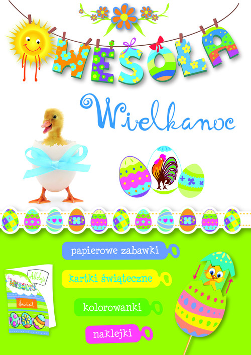 Sięgając po tę książeczkę z wycinankami, rozbudzisz u swojego dziecka artystyczne pasje. Każdy przedszkolak z zapałem przystąpi do składania wielkanocnych ozdób i dekorowania kart z życzeniami, którymi obdaruje najbliższych. Będzie mógł zrobić papierowe pisanki, ale też wielkanocnego zajączka, kolorową kurę i kurczaczka w pisance. Znajdzie także urocze naklejki do uzupełnienia stron książeczki i wykorzystania na świątecznych kartkach.