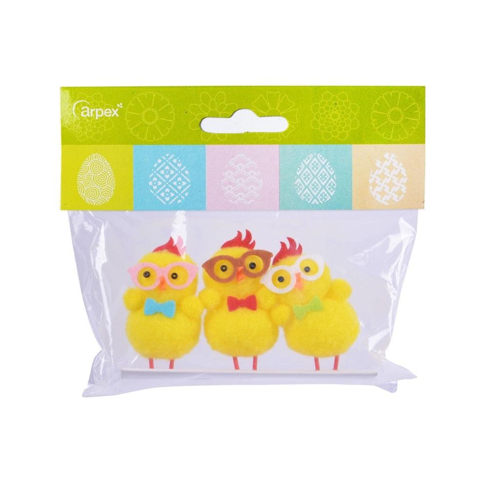 Urocze kolorowe kurczaczki w okularach. Idealne jako ozdoba do koszyczka lub na wielkanocny stół. Pakowane po 3 sztuki. Wysokość figurki to 5 cm.