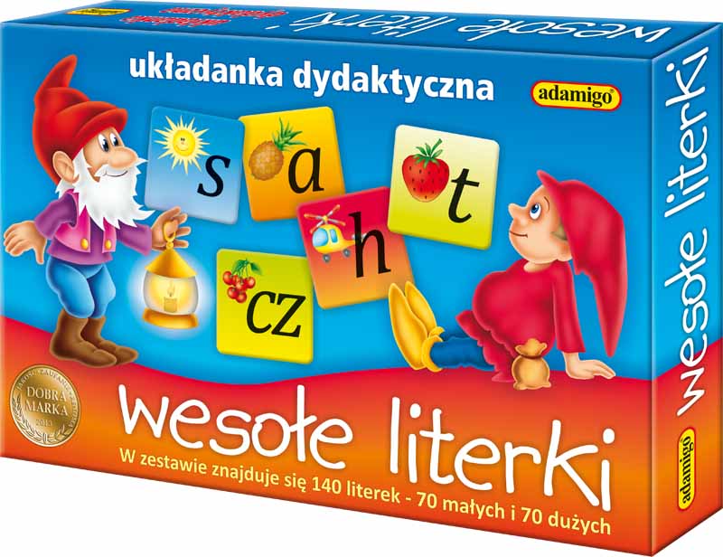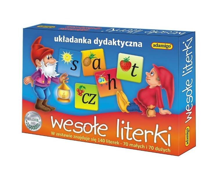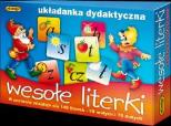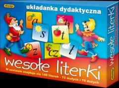 „Wesołe literki” to układanka dydaktyczna, w skład której wchodzi 70 dwustronnie lakierowanych i zadrukowanych, sztywnych kartoników (w sumie układanka zwiera 140 znaków). Układanka polecana jest dla dzieci w wieku przedszkolnym. Uczy, ułatwia zapamiętywanie i utrwala wiedzę w zakresie małych i dużych liter. Z kartoników można układać pierwsze wyrazy, a nawet zdania. Na niektórych kartonikach oprócz literki znajdują się obrazki przedstawiające przedmiot, którego nazwa zaczyna się na literkę znajdująca się na kartoniku. Układanka jest kolorowa, trwała i bezpieczna (rogi kartoników są zaokrąglone). Zestaw gry zawiera: - 70 dwustronnie lakierowanych i zadrukowanych, sztywnych kartoników.