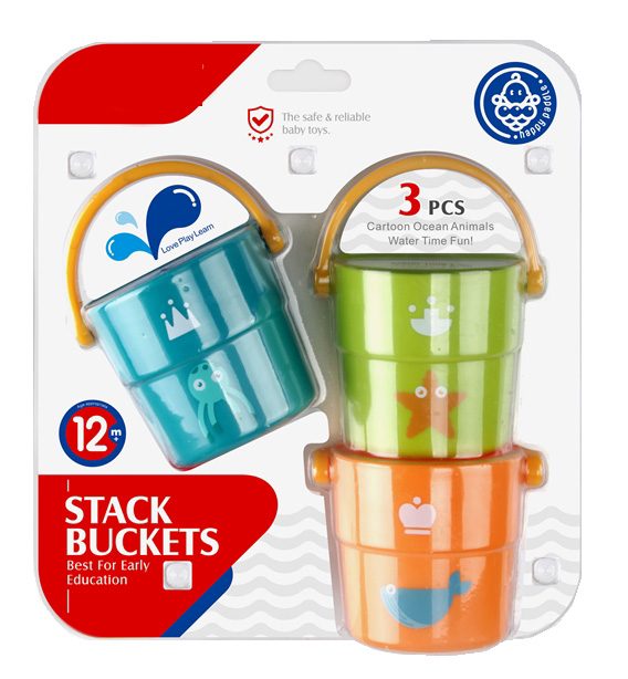 Zestaw trzech kolorowych wiaderek z motywem zwierząt morskich. Zabawka nada się idealnie do zabawy w wodzie i piasku.