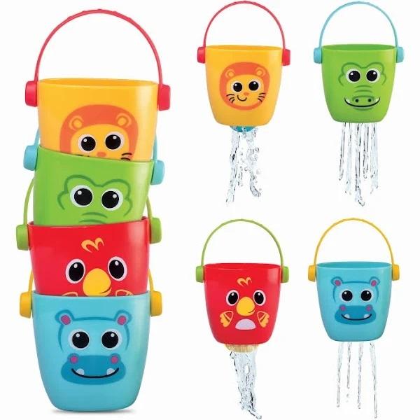 • w zestawie 4 kolorowe wiaderka w otworami (każdy ma inne otwory na spodzie, co daj inny efekt przelewania wody);