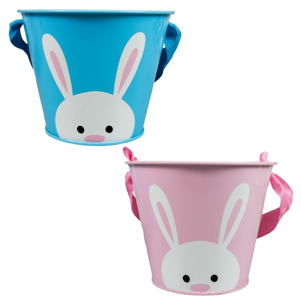 Metalowe wiaderko dekoracyjne to uroczy element wielkanocnych aranżacji. Dostępne w pastelowych kolorach - niebieskim lub różowym - z uroczym nadrukiem białego zajączka z dużymi uszkami. Wiaderko posiada pasującą kolorystycznie tasiemkę. Idealne jako pojemnik na słodycze, kwiaty lub dekoracje. Produkt jest trwały i łatwy w przechowywaniu.