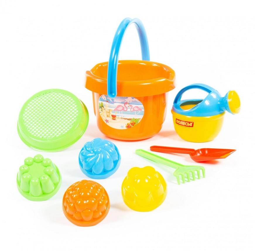 W zestawie wiaderko duże, sito, łopatka, grabki, 4 foremki, konewka mała.