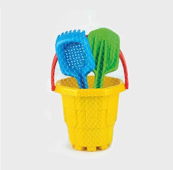 Zestaw zawiera wiaderko w kształcie zamku, grabki oraz łopatkę. Mix kolorów, towar wysyłany losowo.
