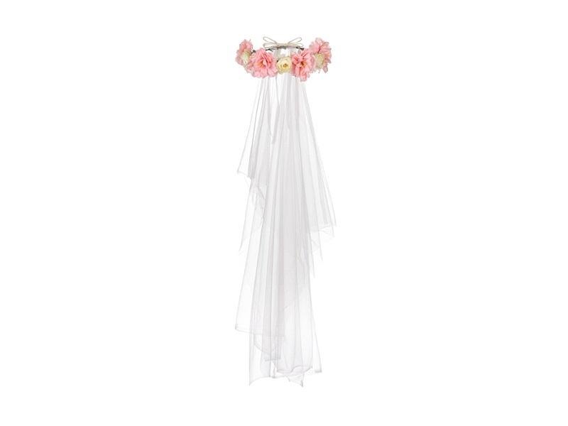 Wianek z kwiatami w kolorze różowym oraz kremowym z welonem w kolorze białym, średnica ok. 17 cm.