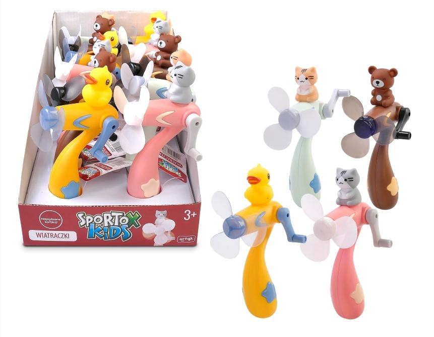 Opis: 12 szt/disp, wys. wiatraczka: 16 cm., 4 wzory: miś, kaczuszka, rudy i szary kotek, nie wymaga baterii, wym. opakowania: 17 x 32 x 16 cm, 3+