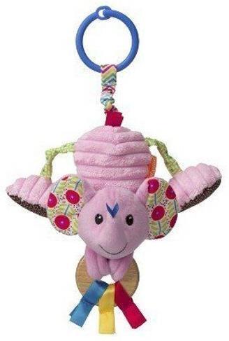 Słonik czeka tylko aby sprawić radość każdemu dziecku. Przymocuj zwierzątko za pomocą specjalnego uchwytu do wózka lub siedzenia samochodowego, pociągnij w dół i zobacz jak wesoło grzechocąc wspina się do góry. Ciekawe kształty i faktury użytych materiałów zachęcają dzieci do zabawy. Dla łatwiejszego chwycenia posiada kółko z naturalnego drewna, które można gryźć.
