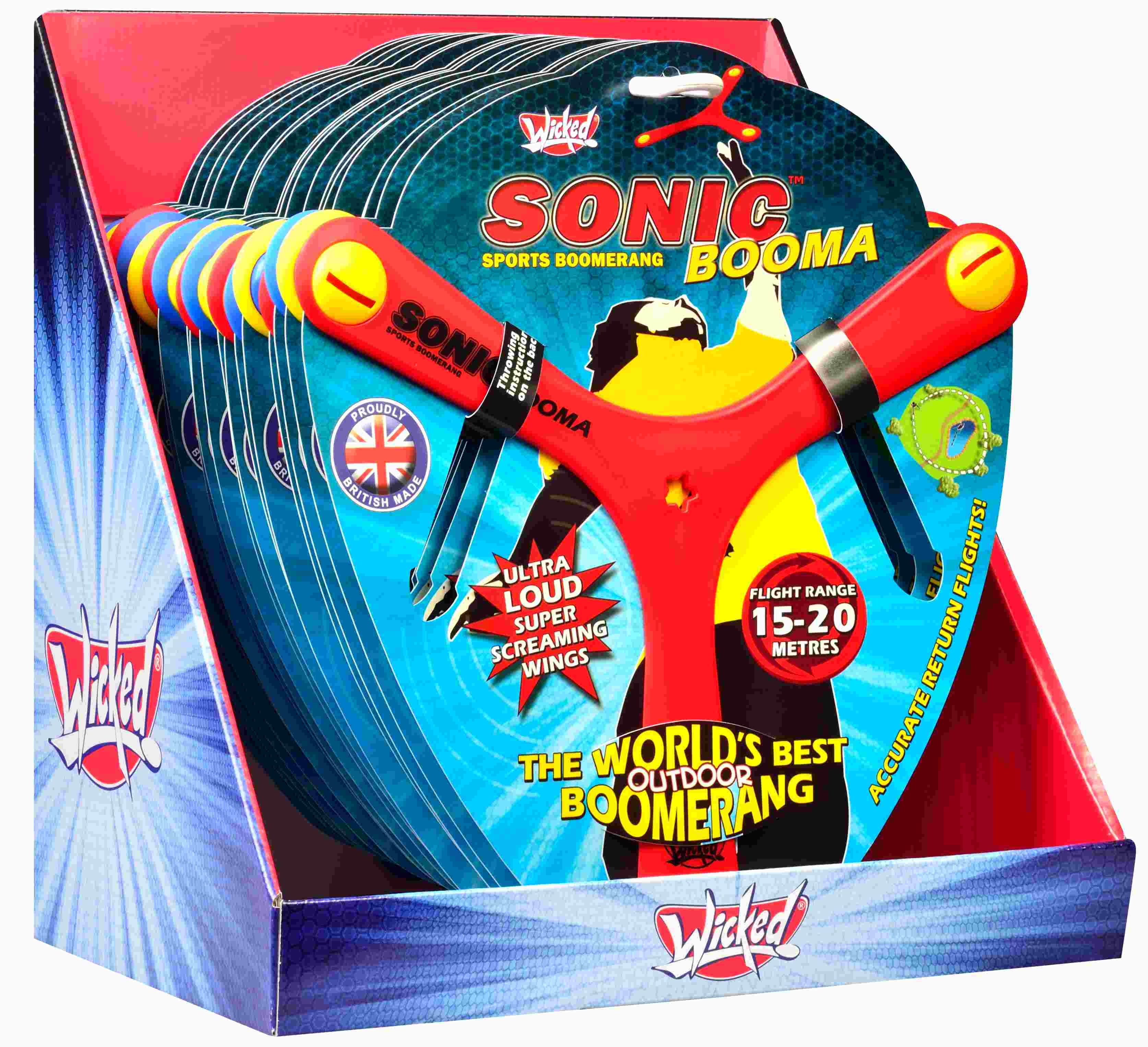 Bumerang z polimeru, gwiżdżący, zasięg 15-20 m, dostępny w kolorze niebieskim, czerwonym i żółtym, wyprodukowany w Wielkiej Brytanii. Wicked Sonic Booma, gwiżdżąca wersja najlepszego powracającego bumerangu na świecie, hipnotyzuje przechodniów, gdy śmiga w powietrzu.  Wicked Sonic Booma oferuje ekscytujące wielozmysłowe wrażenia i niekończącą się rozrywkę dla całej rodziny!