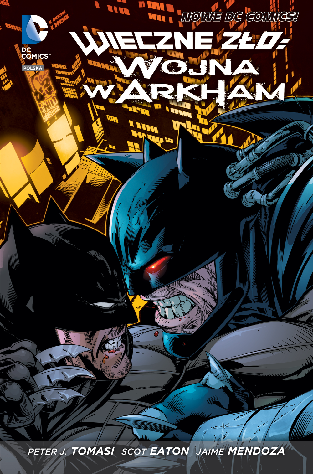Pacjenci z Azylu Arkham atakują! Liga Sprawiedliwości została zmieciona z powierzchni ziemi przez sobowtóry z alternatywnego wszechświata, które utworzyły drużynę zwaną Syndykatem Zbrodni. Gdy zniknął Batman, Gotham pozostało bez opieki. Do walki o miasto ruszyły całe armie przestępców. Najbardziej niebezpieczni pacjenci Azylu Arkham podzielili Gotham na rządzone przez siebie dzielnice, a przywództwo nad wszystkimi szaleńcami objął Strach na Wróble. Z kolei Pingwin sprawuje kontrolę nad miastem z ramienia Syndykatu. Ale to nie koniec nieszczęść – do ataku na Gotham szykuje się armia dowodzona przez starego wroga Batmana, Bane’a. Pierwszym celem najeźdźców staje się Blackgate – więzienie dla superprzestępców. Z pomocą uwolnionych więźniów, Bane ma zamiar zaatakować przebierańców z Arkham. Chce ocalić przed nimi Gotham, nawet jeśli będzie musiał je przy tym zniszczyć. Najwięksi przestępcy świata wybierają strony w wojnie o sprawowanie kontroli nad Gotham City. Peter J. Tomasi (Batman i Robin) oraz Scot Eaton (Detective Comics) przedstawiają historię z serii Wieczne Zło. W Wojnie w Arkham zwycięzca weźmie wszystko!