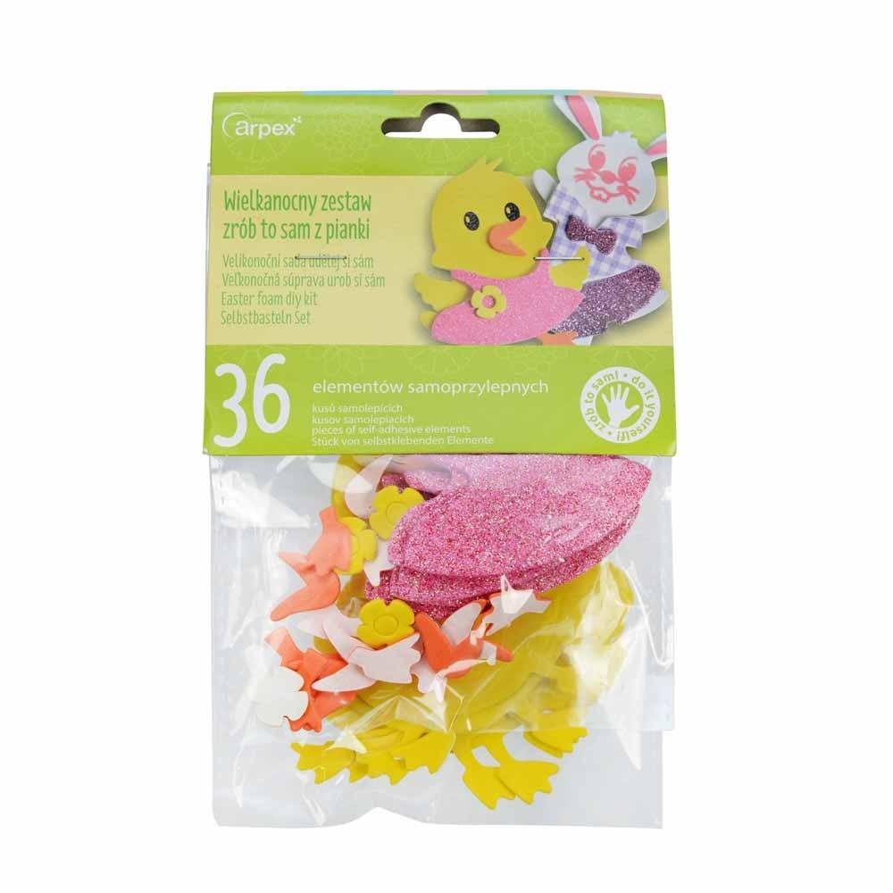 Komplet elementów do samodzielnego wykonania kurczaczka lub króliczka. W skład zestawu wchodzi 36 piankowych elementów samoprzylepnych do stworzenia 6 kompletnych zwierzaków.