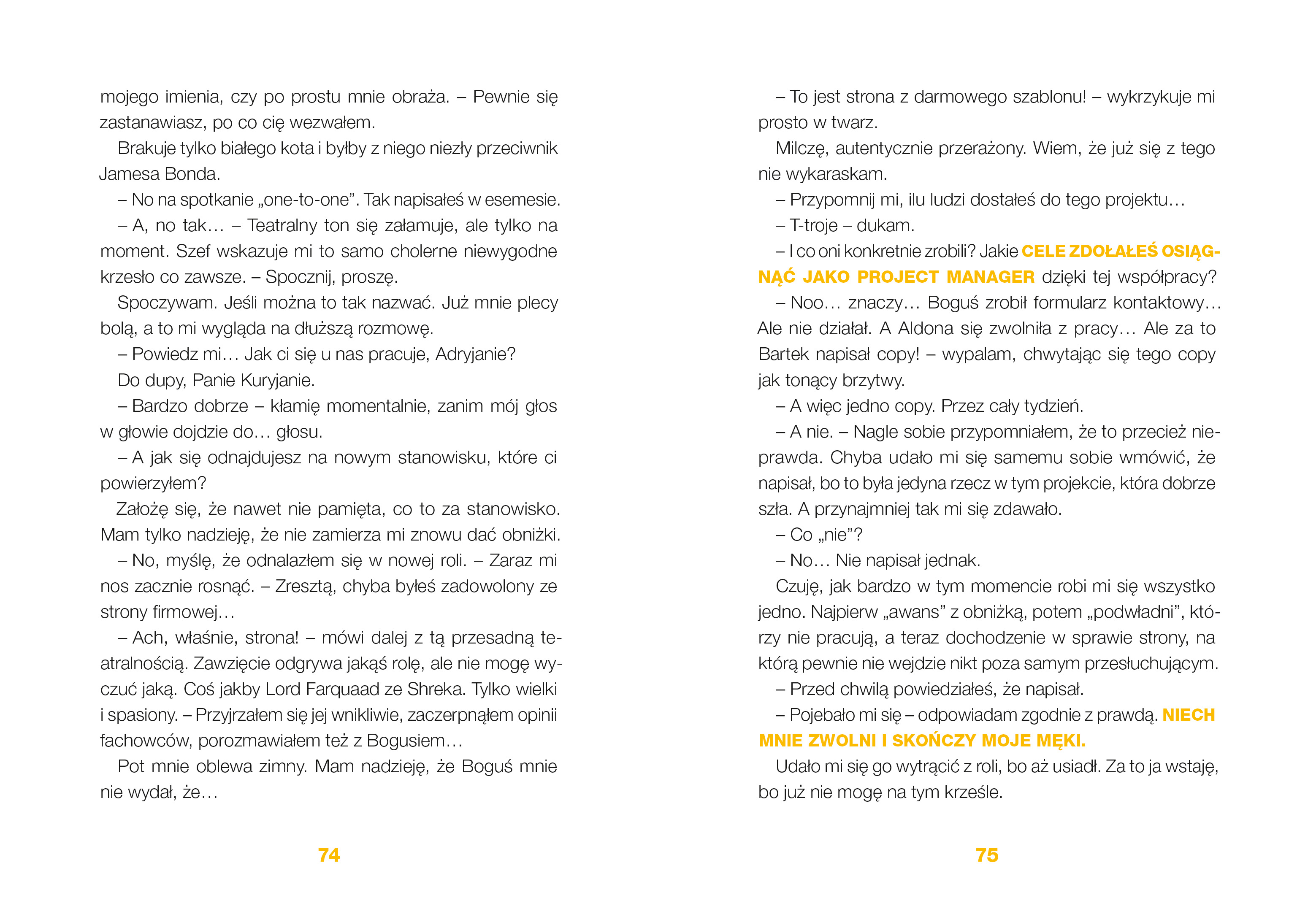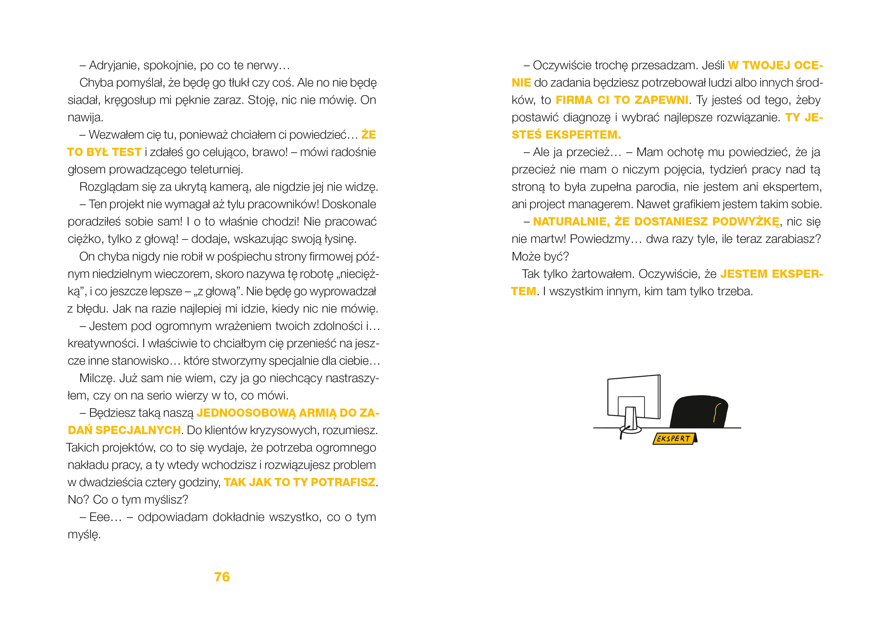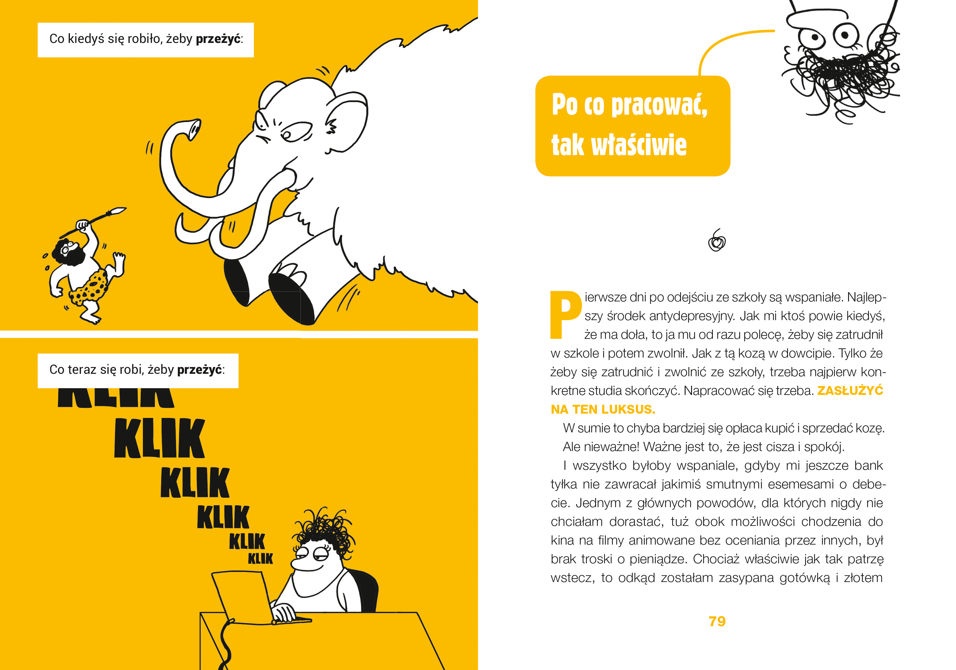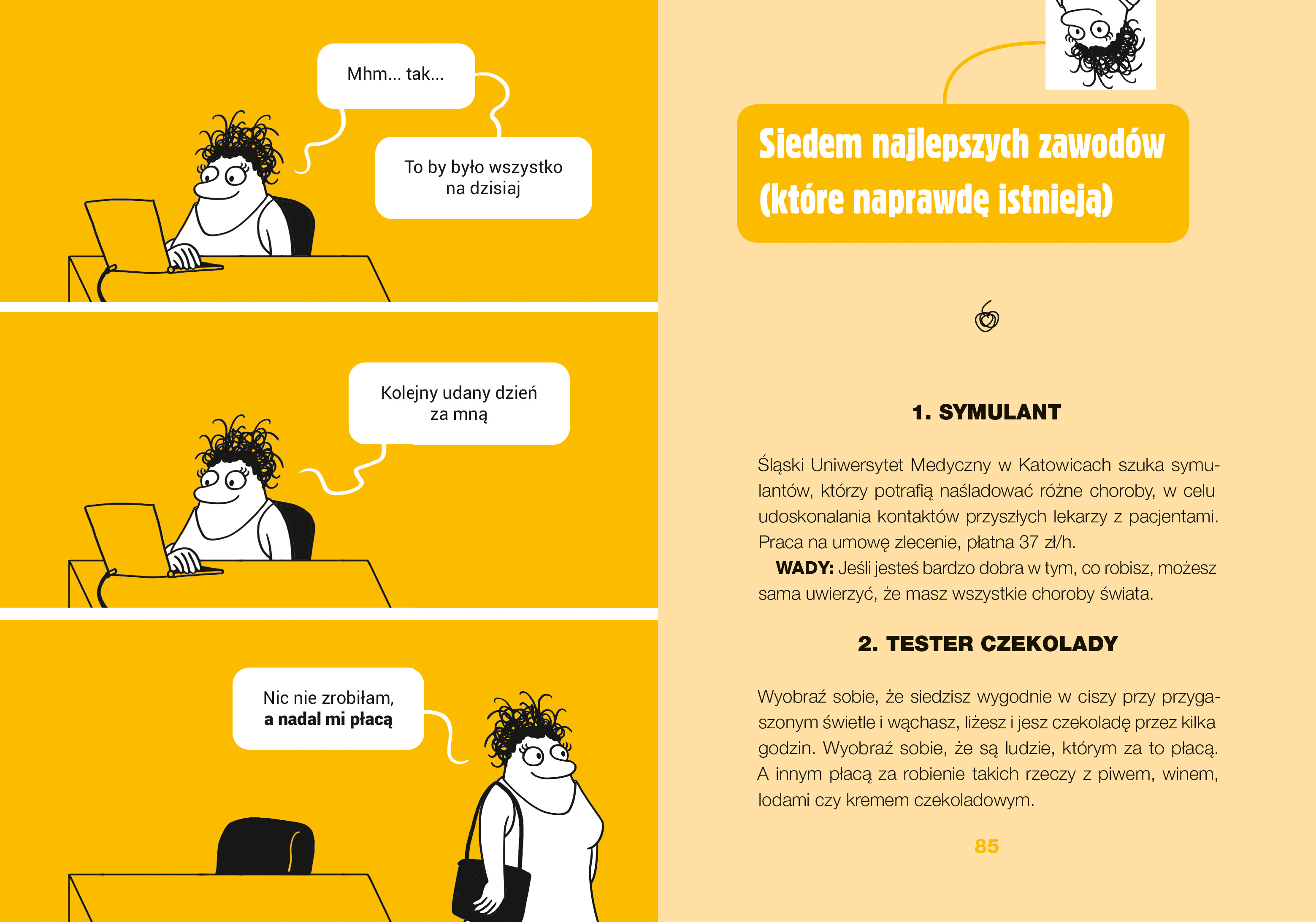 Człowiek uczy się na błędach, zwłaszcza w pracy. Popełniasz wciąż te same pomyłki? Bądź kreatywny, zacznij popełniać nowe! Od Pana Buka dowiesz się, jak dostać obniżkę zamiast podwyżki i dać się przygnieść przez asap, fakap i dedlajn. Jak znaleźć najgorszą pracę na świecie, a potem nie potrafić jej rzucić. A przede wszystkim – po co pracować, tak właściwie. Pani Bukowa nauczy cię, jak przetrwać w korporacyjnej dżungli i ogarnąć wieczór integracyjny w escape roomie. Jak od siedzenia na Fejsie zostać social media ninją. A także jak obeżreć się na szkoleniu i zawsze, ale to zawsze, mieć przy sobie kubek kawy. Bo narzekamy na pracę, ale w sumie bez niej byłoby nudno. Trzeba tylko wiedzieć, jak robić, żeby się nie narobić. Powyższy opis pochodzi od wydawcy
