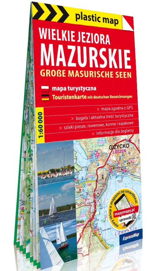 Wielkie Jeziora Mazurskie Dwustronnie foliowana, trwała mapa turystyczna Krainy Wielkich Jezior Mazurskich obejmuje obszar od Węgorzewa na północy po Jezioro Nidzkie na południu. Publikacja została opracowana we współpracy z doświadczonymi krajoznawcami z regionu. Cechy mapy: - dogodna zarówno dla pieszego, rowerzysty, jak i żeglarza, skala 1:60 000 (1 cm – 600 m), - bogata treść turystyczna, - zgodność z GPS – współrzędne geograficzne w układzie WGS-84 Na mapie m.in.: - szlaki piesze i rowerowe, szlaki kajakowe, szlaki żeglugi pasażerskiej, - baza noclegowa, w tym hotele, kempingi, stanice wodne, - treść żeglarska, w tym głębokości jezior, przeszkody i mielizny, przystanie i pomosty, slipy i dźwigi, warsztaty szkutnicze, - muzea, zabytki, bunkry i inne interesujące obiekty, - parki krajobrazowe, rezerwaty przyrody, atrakcje przyrodnicze, - niemieckie nazwy (miejscowości, jezior, rzek, itp.) sprzed II wojny światowej, niemieckie współczesne opisy obiektów - poziomice i cieniowanie pokazujące ukształtowanie terenu.