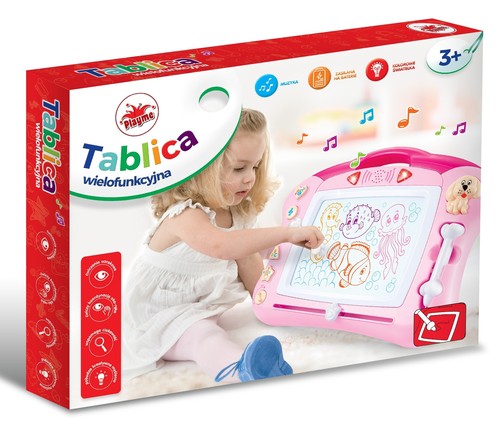 PLAYME - Wielofunkcyjna tablica ze znikopisem - wersja różowa. Funkcje dzwiękowe: 4 piosenki w jęz. angielskim; 10 melodii; 10 odgłosów zwierząt; 5 dzwonków; litery alfabetu w jęz. angielskim od A-Z. Pisząc po tabicy można uzyskać różne kolory, do zestawu dołączona jest jedna pieczątka w kształcie łapki psa. Zabawka wymaga użycia baterii 3X1,5AA (nie dołączono) Zabawka dla dzieci powyżej 3 lat.