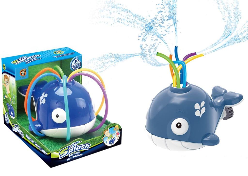 Wieloryb, który po dopięciu do niego węża z wodą, pryska wodą bawiące się dzieci.