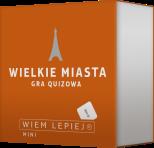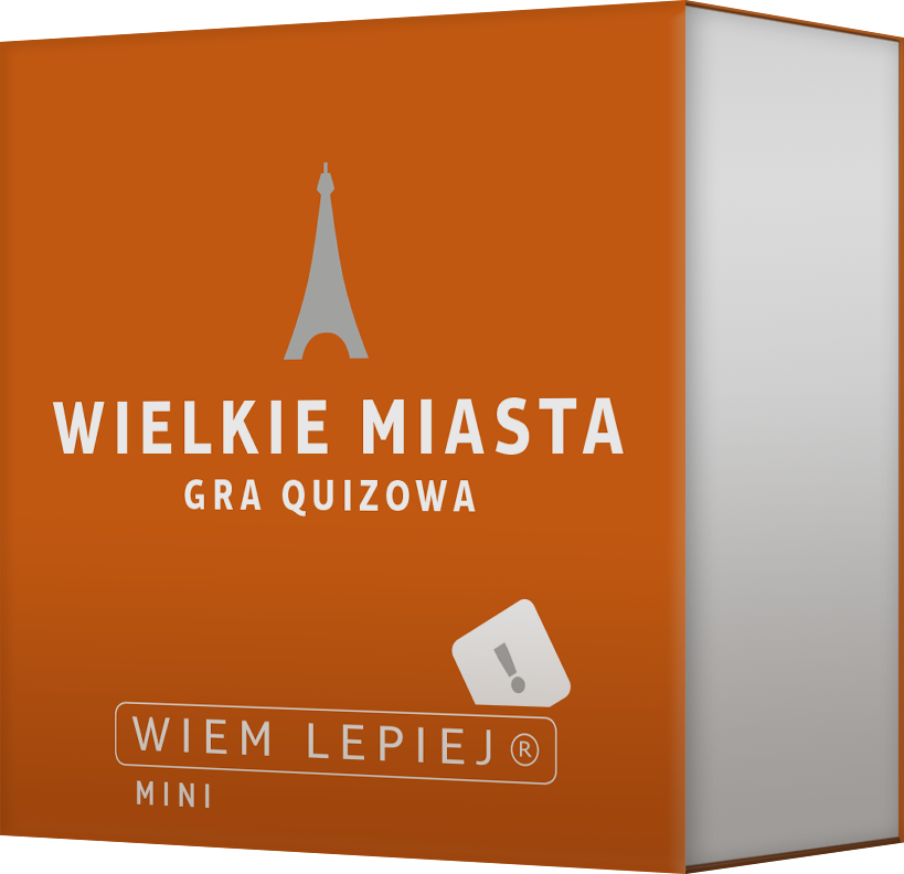 Wiem lepiej: Wielkie miasta to 60 pytań, które zabiorą Was w podróż po całym świecie (a na pewno po najważniejszych miastach). Możecie odpowiadać na pytania tylko z tej kategorii, ale też wykorzystać zestaw jako dodatek do taktycznej gry quizowej Wiem lepiej. W pudełku znajdziesz płytkę kategorii, którą możesz dołączyć do puli podstawowych lub zastąpić nią jedną z nich.