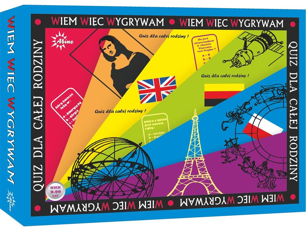 WIEM WIĘC WYGRYWAM to planszowa gra quizowa dla całej rodziny. Ponad 150 kart z pytaniami z 5 dziedzin, zadania specjalne i dużo emocji. Wiek: od 6 lat