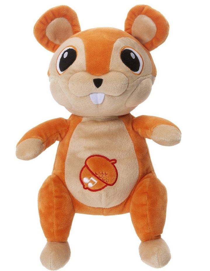 Delikatny w dotyku materiał i miękkie wypełnienie zachęca do przytulania i pieszczot, zwiększając poczucie bezpieczeństwa maluszka. Efekty świetlne i melodie są włączane i wyłączane poprzez naciśnięcie żołędzia na brzuszku wiewiórki.