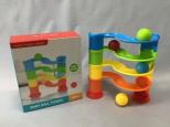 Idealna zabawka dla malucha. Dziecko na najwyższym poziomie toru kładzie kolorową piłeczkę i patrzy jak piłka toczy się po niższych poziomach. Zabawka pobudza ciekawość dziecka i daje dużo radości w łapaniu spadających piłeczek. tor 28x10x28 cm, 4 poziomy, 4 piłeczki. Wiek: 12m+ Wymiary opakowania: 24.5x11x28 cm
