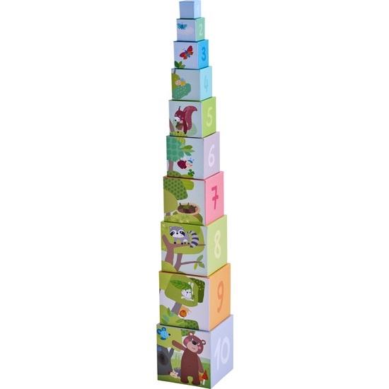 Wieża z kostek - Leśne zwierzątka dzięki zróżnicowanym kostkom pozwala dzieciom ćwiczyć pierwsze cyfry i układanie według rozmiaru.