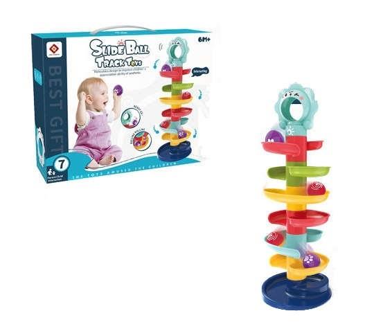 Wieża z piłeczką to 7 piętrowa konstrukcja, która pozwala na zabawę maluchowi już od 6 miesiąca życia. Kolorowa serpentyna, jaką jest wieża, przyciąga wzrok dziecka. Maluch lub rodzic wrzuca piłeczkę na górę wieży, a dziecko obserwuje, jak się porusza. W ten sposób uczy się zasad przyczyny i skutku i rozwija sprawność ruchową.