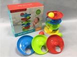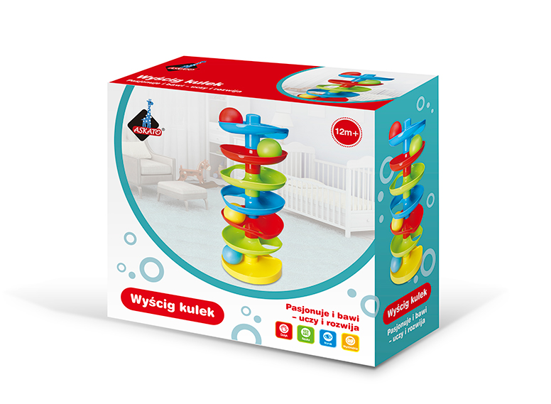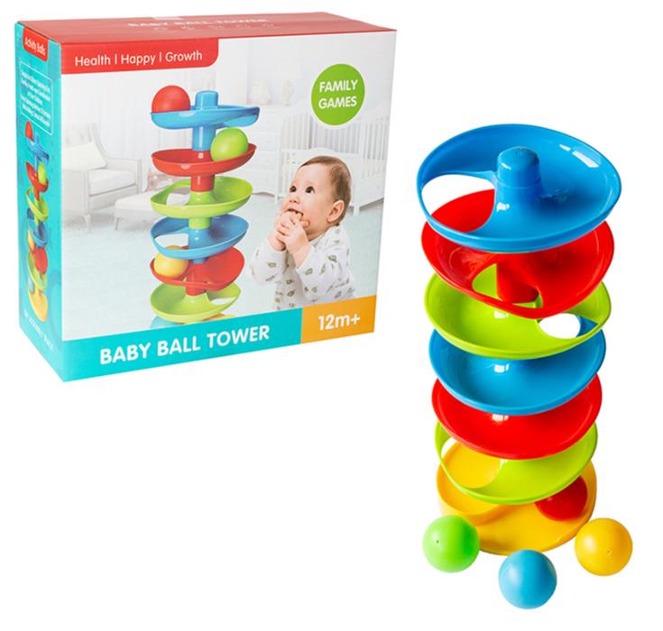 Zakręcona wieża z piłeczkamiIdealna zabawka dla malucha. Dziecko na najwyższym poziomie kładzie kolorową piłeczkę i patrzy jak piłka toczy się po niższych poziomach. Zabawka pobudza ciekawość dziecka i daje dużo radości w łapaniu spadających piłeczek. wieża 15x37 cm, 7 poziomów, 4 piłeczki Wiek: 12m+ Wymiary opakowania: 27.5x11.5x25.5 cm
