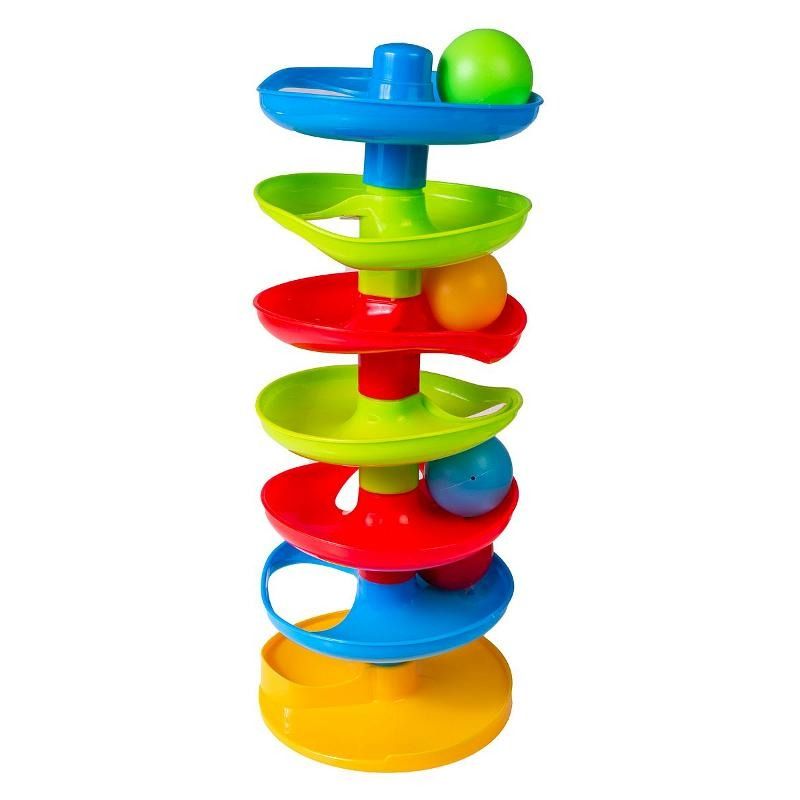Wieża z piłeczkami do zabawy dla maluszka. Dziecko chwyta jedną z 3 kolorowych, grzechoczących piłeczek, a następnie wrzuca je na samą górę, piłeczka toczy się na sam dół wieży i wypada jednym wyjściem.