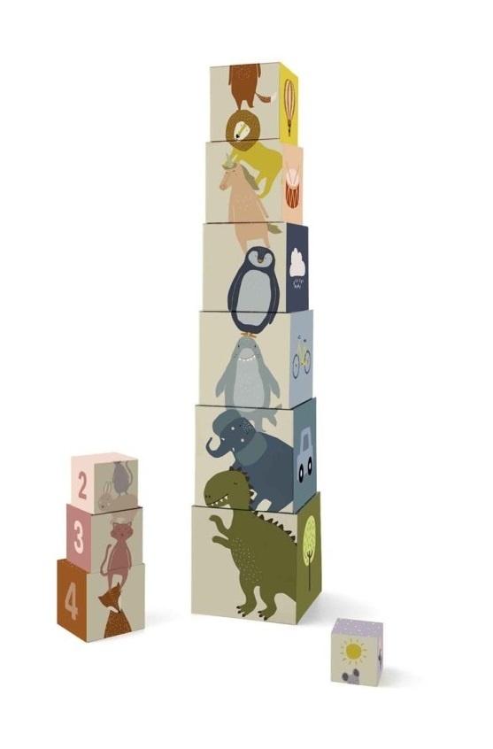 Zabawa, nauka i odkrywanie - wszystko w jednym! Ten zestaw 10 kolorowych klocków zapewni maluchowi długie godziny radosnej aktywności. Każda ścianka klocka to nowa niespodzianka - zwierzaki, liczby, przedmioty i obrazki do układania w formie prostych puzzli. Dzięki różnorodnym motywom dziecko może: budować wysoką wieżę, dopasowywać wielkości, rozpoznawać kolory i liczby, układać ilustracje i poznawać zwierzątka. Klocki zostały wykonane z wytrzymałego kartonu z certyfikatem FSC(R) oraz nadrukowane bezpiecznym tuszem sojowym i zabezpieczone wodnym lakierem - bezpieczne i ekologiczne. Wiek: 12 miesięcy+ Materiał: Karton FSC(R), tusz sojowy, wodny lakier
