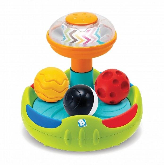 Naciśnij górę urządzenia, wrzuć piłeczki i zobacz jak wirują. Zawiera 2 miękkie piłeczki i 1 plastikową. Różne faktury, kształty i kolory pobudzą wyobraźnię dziecka i zachęcą do zabawy, która rozwinie zmysły.