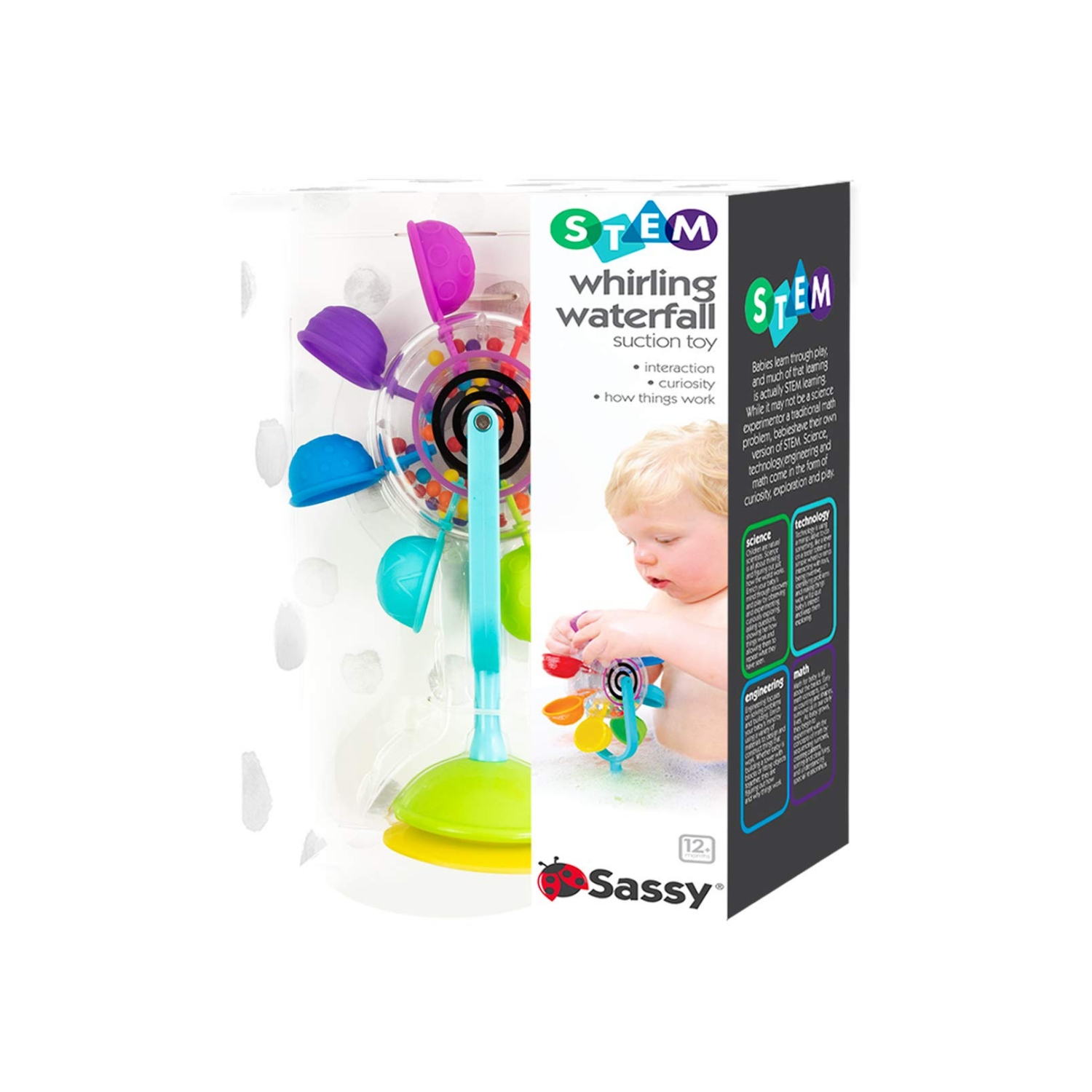 Wyjątkowa zabawka zasilana wodą - wirujący wodospad, który wystarczy przykleić do dna lub boku wanny, nalać wody na kolorowe łyżeczki i można oglądać, jak koło się obraca. Podczas kręcenia, koraliki grzechoczą w środku, aby stymulować słuch.