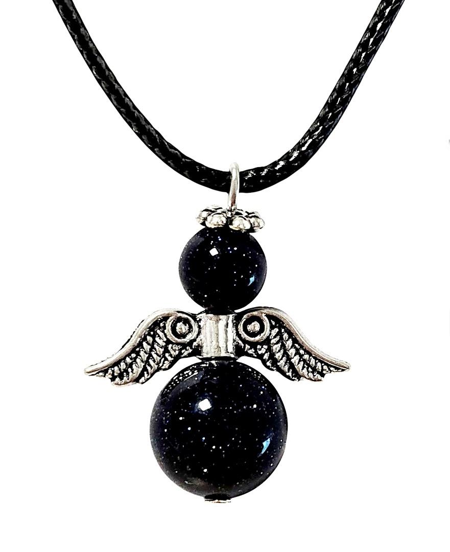 Wisiorek Aniołek z Naturalnych Kamieni na Woskowanym Sznurku - Skrzydła i Aureolka, 21x23 mm.