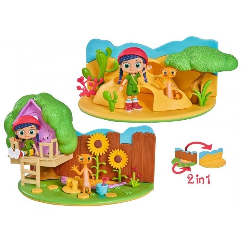 Zestaw Wissper Świat Pustyni 2w1 . Przenieś się do bajkowej krainy wraz z Wissper i bohaterami bajki. W animacji, bohaterce Wissper towarzyszą zwierzątka z różnych światów przyrody. Monty to surykatka reprezentująca świat pustyni. Zestaw 2 w 1 daje możliwość zmiany dwóch scenerii. Zawiera śliczny domek na drzewie z otoczeniem, roślinami i akcesoriami lub - po odwróceniu scenerii - pustynny krajobraz z norkami, w których może chować się surykatka. Figurka Wissper i surykatki Monty'ego dopełniają całości.