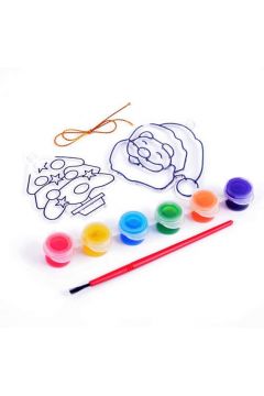 Zestaw dla dzieci do malowania. Zawiera 2 witrażyki, pędzel, farbki 6 kolorów i złote sznureczki do zawieszenia. Wymiar witrażyka: 5-7 cm.