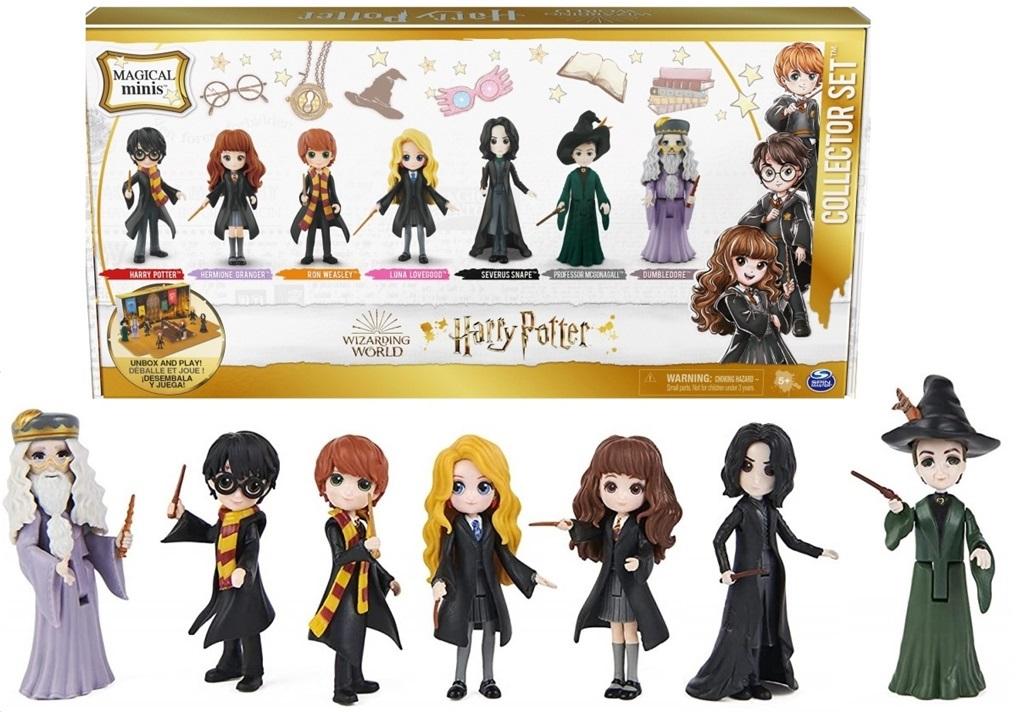 Dodaj do kolekcji swoje ulubione postaci ze świata Harry'ego Pottera, dzięki zestawowi kolekcjonerskiemu Wizarding World Magical Minis. Ten zestaw zawiera siedem 3-calowych figurek, które musi mieć każdy fan Harry'ego Pottera. Zawiera Harry'ego Pottera, Hermionę Granger, Rona Weasleya, Lunę Lovegood, Severusa Snape'a, Albusa Dumbledora i wyjątkową figurkę profesor McGonagall, której nie znajdziesz nigdzie indziej. Każda z 3-calowych figurek jest bardzo szczegółowa i ożywia ukochane postacie ze świata Harry'ego Pottera. Od mundurka i szalika Gryffindoru Harry'ego, przez szmaragdową szatę oraz spiczasty kapelusz profesor McGonagall po brodę i szatę Dumbledore'a - te magiczne przedmioty kolekcjonerskie z serii Magical Minis są gotowe na niekończące się czarujące przygody! Gdy już rozpakujesz swoje figurki, opakowania mogą służyć jako tekturowe zestaw do zabawy w Wielkiej Sali. Rozłóż papierowe ławki i stoły jadalne, po czym przejdź od razu do zabawy! Ustaw swoje postaci tak, aby usiadły na ławkach i ruszaj ich głowami oraz ramionami, jakby rzucały zaklęcia i odtwarzały Twoje ulubione momenty z filmu. Zestaw kolekcjonera to doskonały sposób, aby pobudzić wyobraźnię. Rozszerz swój czarodziejski świat o magiczny o Magical Minis zamek Hogwart, Zestaw przyjaźni albo zestaw z lalkami (każdy sprzedawany osobno), aby zyskać jeszcze więcej okazji do zabawy! Zestaw kolekcjonerski Magical Minis to świetny prezent dla dziewczynek od lat 5. Odtwarzaj swoje ulubione sceny z Harry'ego Pottera dzięki zestawowi kolekcjonerskiemu Magical Minis!