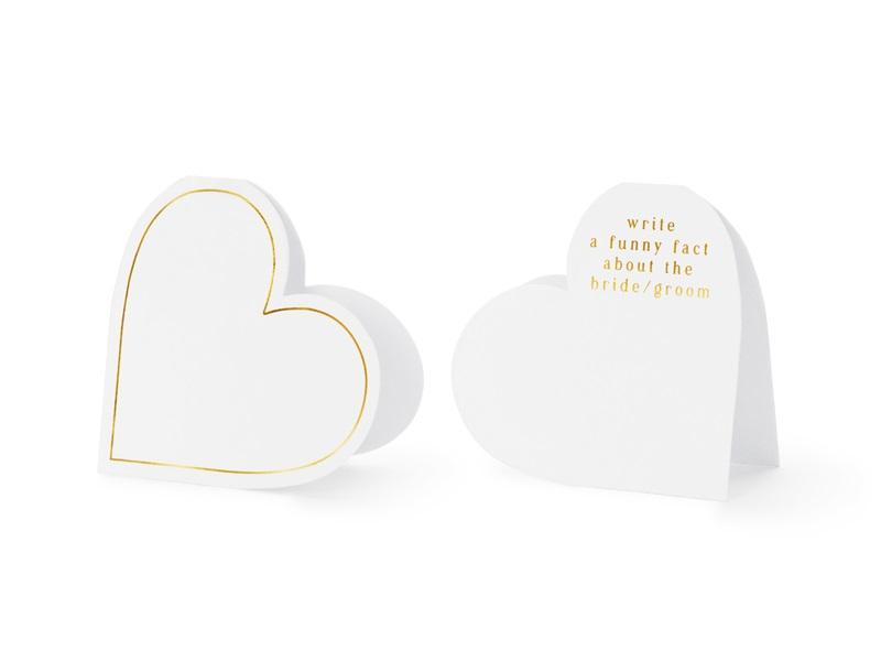 Wizytówki na stół Serca w kolorze białym ze złotym nadrukiem, wymiary ok. 15.7 x 22 cm.(1 op. / 10 szt.)