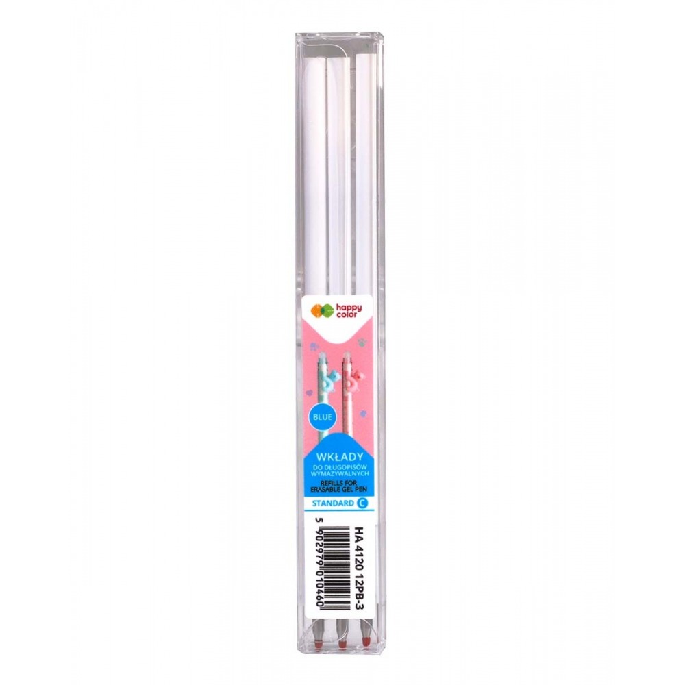 Wkłady do długopisów wymazywalnych. Kolor linii pisania: niebieski (crystal blue). Grubość linii pisania: 0,5 mm. Końcówka kulkowa. Wkłady Standard C do długopisów Pastel Bears. 3 sztuki w etui.