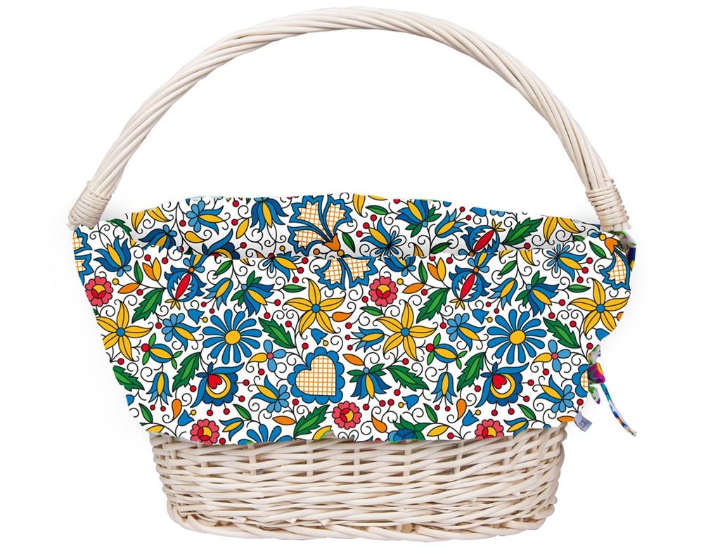 Kaszubski folk wkład do koszyka rowerowego/zakupowego:wykonany ze 100% bawełny,biały z nadrukowanymi kolorowymi kwiatami kaszubskimi,