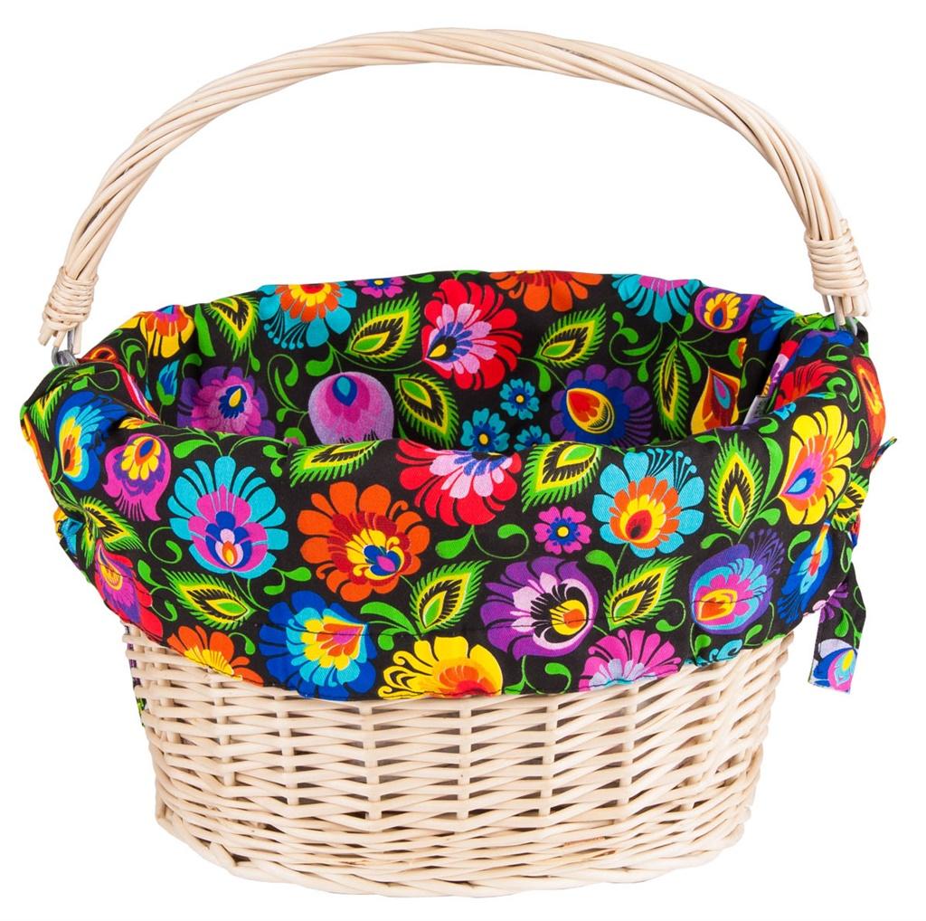 Folk wkład do koszyka rowerowego/zakupowego - czarny: wykonany ze 100% bawełny,czarny z nadrukowanymi kolorowymi kwiatami łowickimi,rozmiar uniwersalny - pasuje do większości koszy na rower,zachwyca intensywną gamą kolorów,zalecamy prać w temp. 40 ,prasować w max. temp. 160 ,