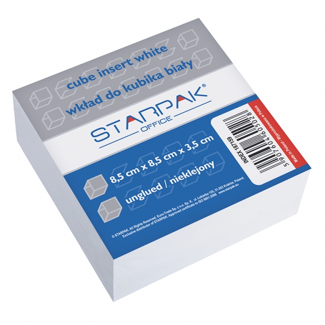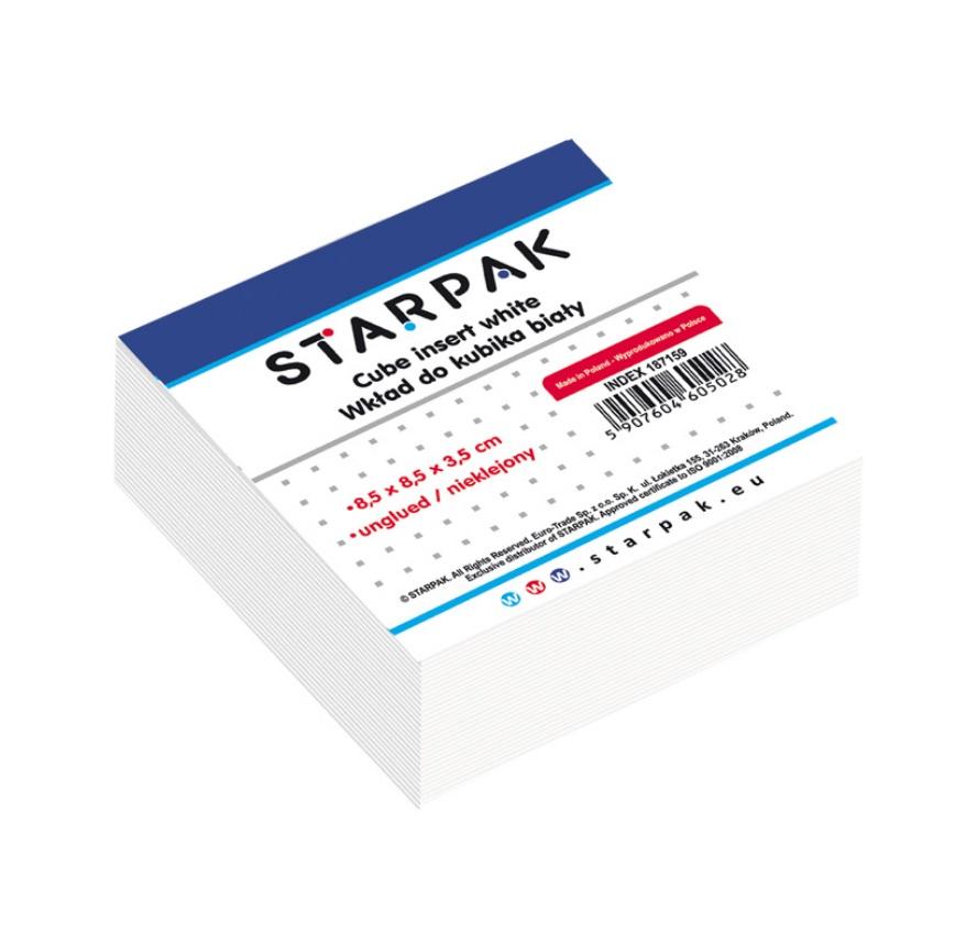 Blok białych karteczek do notowania, pasujący do pojemników metalowych i plastikowych Starpak. Wymiary 85 x 85 mm.