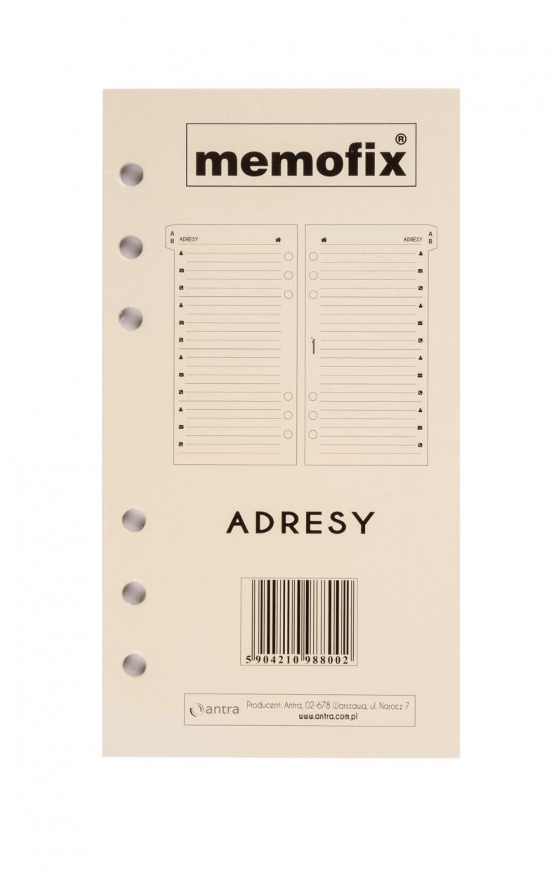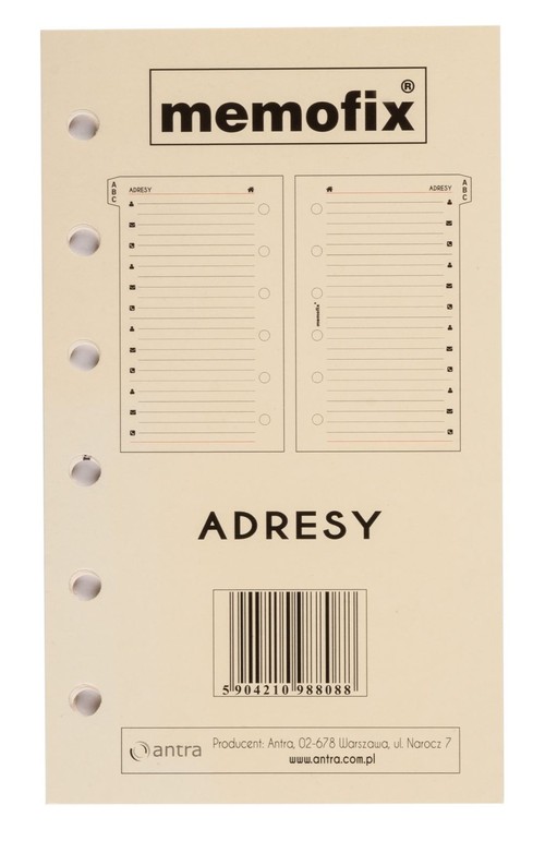 MEMOFIX/KIESZONKA/ADRESY Wymiary: 125x80 mm Kolor kartek: ecru Ilość kartek: 20 szt. Ilość dziurek: 6 szt.