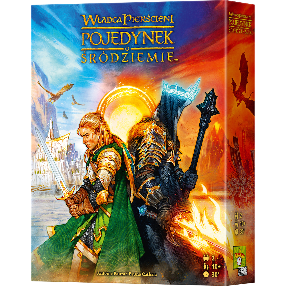 Stajesz się panem Śródziemia. Możesz wcielić się w postać Saurona, który posyła wojska pod bramy miast, by pochwycić Sama i Froda lub dowódcy Drużyną Pierścienia i obrońcy wolnych ras. "Władca Pierścieni: Pojedynek o Śródziemie" jest grą strategiczną opartą na takich samych regułach jak "7 Cudów Świata: Pojedynek". Została opracowana w taki sposób, by zawodnicy wzajemnie się kontrolowali, a każdy ruch miał istotny wpływ na ostateczny wynik. Za sprawą nowych rozwiązań tj. zmiana toru militarnego na wyścig czy pojawienie się planszy z mapą rozgrywka staje się jeszcze ciekawsza. Nie będą się z nią nudzić fani twórczości Tolkiena ani wytrawni użytkownicy planszówek. "Władca Pierścieni: Pojedynek o Śródziemie" składa się z trzech rozdziałów, w trakcie których zawodnicy rozwijają swoje strategie przy udziale płytek ważnych miejsc i kart rozdziału. Uczestnicy gry mogą przeć do zwycięstwa na trzy sposoby: poprzez ukończenie Wyprawy Pierścienia, zawarcie sojuszy z sześcioma rasami albo budowanie swojej obecności w różnych rejonach Śródziemia. Zawartość: plansza główna 4-częściowy tor 69 kart 44 pionki 18 żetonów 30 monet 7 płytek pomoc gracza instrukcja Liczba graczy 2 Wiek 10+
