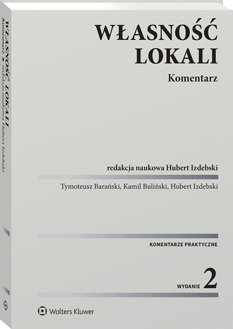 W komentarzu w ujęciu praktycznym przedstawiono najważniejsze zagadnienia uregulowane ustawą o własności lokali. Dokładnej analizie poddano najczęściej występujące problemy związane z takimi kwestiami, jak: ustanowienie własności lokalu, prawa i obowiązki właścicieli lokali czy zarząd nieruchomością wspólną. Autorzy omówili problemy istotne dla praktyki stosowania przepisów i w tym celu szeroko wykorzystali nie tylko najnowsze orzecznictwo Sądu Najwyższego, sądów powszechnych oraz sądów administracyjnych, lecz także własne doświadczenia zawodowe w tej dziedzinie. W drugim wydaniu szczególną uwagę zwrócono na nowelizację z 10.12.2020 r. (ustawa o zmianie niektórych ustaw wspierających rozwój mieszkalnictwa) zmieniającą sytuację części wspólnot mieszkaniowych, które otrzymały nowe kompetencje wraz ze zmianą statusu. Modyfikacja tych przepisów znacznie ułatwiła ich funkcjonowanie i podejmowanie decyzji we wspólnocie. Publikacja jest przeznaczona dla radców prawnych, adwokatów, notariuszy oraz sędziów. Zainteresuje również pracowników administracji zajmujących się gospodarką nieruchomościami, deweloperów, zarządców i administratorów budynków mieszkalnych, a także właścicieli lokali.