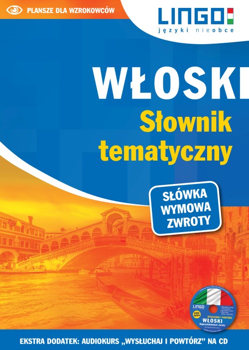 Jeśli uczysz się włoskiego i szukasz książki, która pomoże Ci uporządkować znajomość włoskich słówek obejmujących najważniejsze dziedziny życia - Włoski. Słownik tematyczny jest w sam raz dla Ciebie. To książka z nowej serii pomocy językowych Lingo, będąca zarówno szybką ściągą do klasówki czy egzaminu dla uczniów i studentów, jak i pomocą dla wyjeżdżających do słonecznej Italii. Zalety książki: - podejście praktyczne i nastawienie na walor użytkowy: słownictwo z różnych sfer życia w podziale na 15 rozdziałów tematycznych - słówka opatrzone wygodnym dla użytkownika uproszczonym zapisem wymowy - specjalne strony dla wzrokowców z wyborem słówek z danego bloku tematycznego przedstawionym na graficznych planszach - ekstra dodatek: płyta CD MP3 z kursem audio „Wysłuchaj i powtórz”. To nagrania najprzydatniejszych zwrotów z tłumaczeniami w wykonaniu native speakera i polskiego lektora: skuteczny sposób na naukę ze słuchu. [opis krótki] Książka z nowej serii pomocy językowych Lingo, przeznaczona dla osób, chcących uporządkować swoją znajomość włoskiej leksyki; to też szybka ściąga do klasówki czy egzaminu dla uczniów i studentów, jak i pomoc dla wyjeżdżających za granicę. Zawiera: słownictwo z różnych sfer życia z wygodnym dla użytkownika uproszczonym zapisem wymowy, specjalne strony dla wzrokowców, ekstra dodatek: CD MP3 z kursem audio „Wysłuchaj i powtórz”.