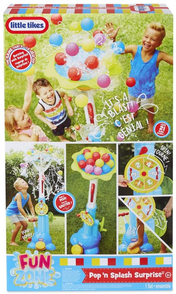 Strefa zabawy Pop n Splash Surprise to pełna niespodzianek interaktywna gra! Gracze po kolei obracają kołem, które wskazuje co należy zrobić: nacisnąć na podkładkę, użyć ręcznej pompki lub obracać korbą. Wykonanie każdej z tych czynności powoduje uruchomienie Popn Splash, czyli wystrzelenie piłeczek/wody w powietrze! Pociągnięcie w dół czerwonych uchwytów resetuje grę.