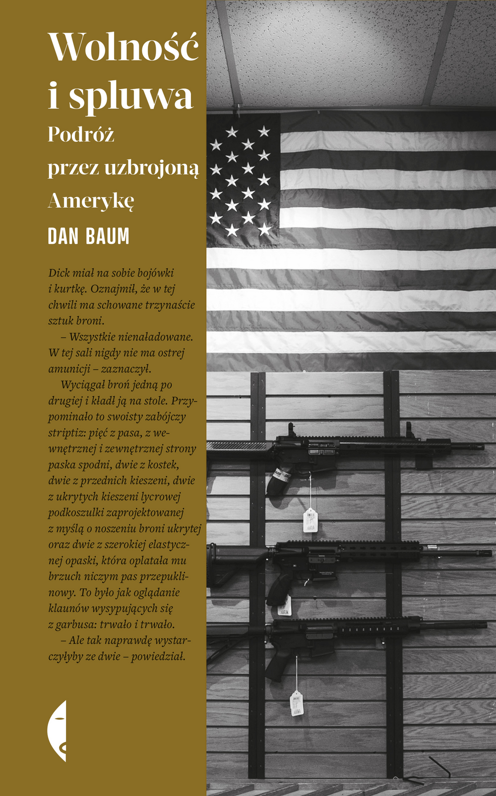 Dan Baum od dziecka interesował się bronią. Z wiekiem do zachwytu dołączyła refleksja: czy w dobie masakr można jeszcze mówić o „zdrowej fascynacji bronią”? Czy kolejne strzelaniny nie powinny wpłynąć na zaostrzenie prawa? A może przeciwnie – jedynie powszechny dostęp do broni poprawiłby bezpieczeństwo mieszkańców USA? W tym kraju wolności druga poprawka do konstytucji gwarantująca prawo do noszenia broni nieustannie podsyca żar dyskusji. Czy to możliwe, że prawda leży pomiędzy stanowiskami zagorzałych zwolenników i zdeklarowanych przeciwników? Aby znaleźć odpowiedź, autor rusza w podróż po stanach, w których dostęp do broni stanowi podstawę wolności obywatelskiej. Rozmawia ze sportowcami, filmowcami, kobietami i mężczyznami, których pasją jest strzelectwo, kolekcjonerami i działaczami społecznymi, którzy walczą o odczarowanie złej sławy „kultury strzelania”. „Wolność i spluwa” znakomicie opowiada o fenomenie „uzbrojonej Ameryki”. Jak mówi jeden z bohaterów książki: „ludzie kochają broń i jej nienawidzą. Zazwyczaj jednocześnie”. „Dan Baum jest w Ameryce przedstawicielem gatunku niemal równie wymarłego jak ptak dodo: liberałem, który nie tylko popiera bezwarunkowe prawo do noszenia broni, ale i sam ma jej sporą kolekcję. „Wolność i spluwa” to efekt jego dziennikarskiego śledztwa: podróżując przez Amerykę, odwiedzając sklepy, strzelnice i festyny oraz rozmawiając z pasjonatami, Baum poszukiwał odpowiedzi na pytanie, dlaczego Amerykanie tak kochają broń palną (oraz tak jej nienawidzą). I choć niektóre wnioski mogą wydać się kontrowersyjne, wgląd w sposób myślenia właścicieli karabinów samopowtarzalnych i noszonych do kościoła pistoletów jest fascynujący. Uważają oni, że druga poprawka gwarantuje im wolność, która jest ważniejsza od bezpieczeństwa. A noszenie broni to dla nich wyraz odpowiedzialności za siebie i otoczenie, męskości, indywidualizmu i patriotyzmu. „Zrozumielibyście nas lepiej, gdybyście podeszli do nas jako do przedstawicieli jednej z wielkich religii”, powiedział pewien lider Narodowego Stowarzyszenia Strzeleckiego. Baum przybliża jej teologię.” Katarzyna Wężyk „Dan Baum jest tym, czego Ameryka potrzebuje teraz najbardziej – liberałem z bronią.” „The Dallas News” „„Wolność i spluwa” to szczery i pozbawiony uprzedzeń przewodnik po amerykańskiej kulturze broni. Swoją książką Baum wyświadczył społeczeństwu ogromną przysługę.” „The Christian Science Monitor” „Baum pozwala nam zrozumieć motywację i argumenty wielu Amerykanów popierających prawo posiadania broni i z ogromną wnikliwością prezentuje kalejdoskop postaci związanych z hasłem „wolność i spluwa”. ” „New York Review of Books” „Przemyślane i świetnie uzasadnione antidotum na spolaryzowaną histerię związaną z problemem posiadania broni. Baum prezentuje zupełnie świeże stanowisko wobec drugiej poprawki – kompromis.” „San Fransisco Chronicle”