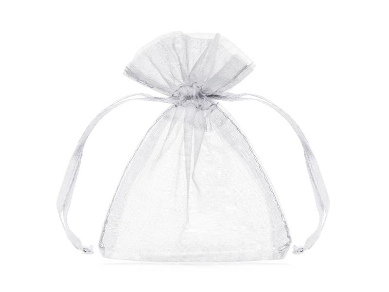 Ściągane woreczki z gładkiej organzy w kolorze białym, wymiary ok. 7.5 x 10 cm. Idealne dla gości weselnych.(1 op. / 10 szt.)