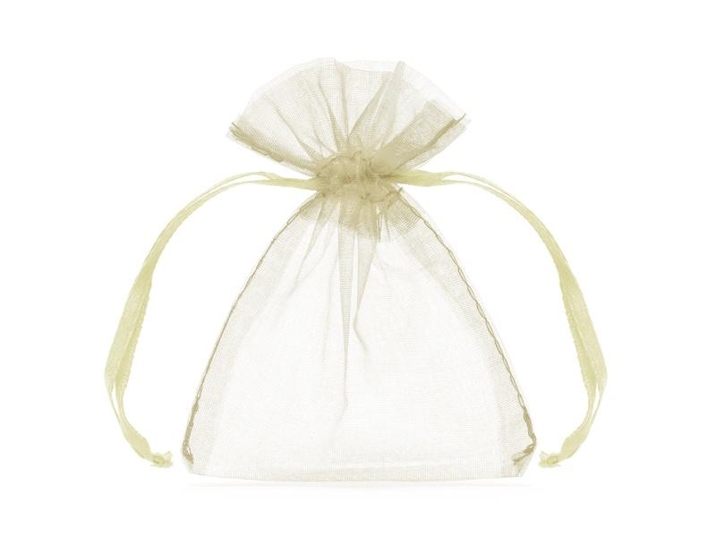 Ściągane woreczki z gładkiej organzy w kolorze kremowym, wymiary ok. 7.5 x 10 cm. Idealne dla gości weselnych.(1 op. / 10 szt.)